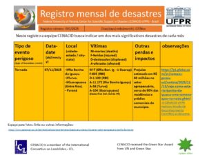 O CENACID esteve em Rio Bonito do Iguaçu e realizou reconhecimento no município mais afetado pelo tornado. O município foi severamente atingido pelo propcesso perigoso. As edificações foram parcial ou totalmente destruídas em mais da metade da área da sede e toda a população foi afetada. Serviços como energia e água foram atingidos, mas progressivamente retomados nos primeiros dias pós-desastre. A equipe ainda não tinha presenciado intensidade desta magnitude em processos deste tipo no Brasil. O impacto direto foi semelhante ao de um furacão, mas atingindo área limitada. O centro está estudando as caracteristicas deste desastre com o propósito de colaborar para redução de impactos no futuro. A UFPR está sensibilizada para apoiar a restauração e reconstrução das comunidades afetadas.